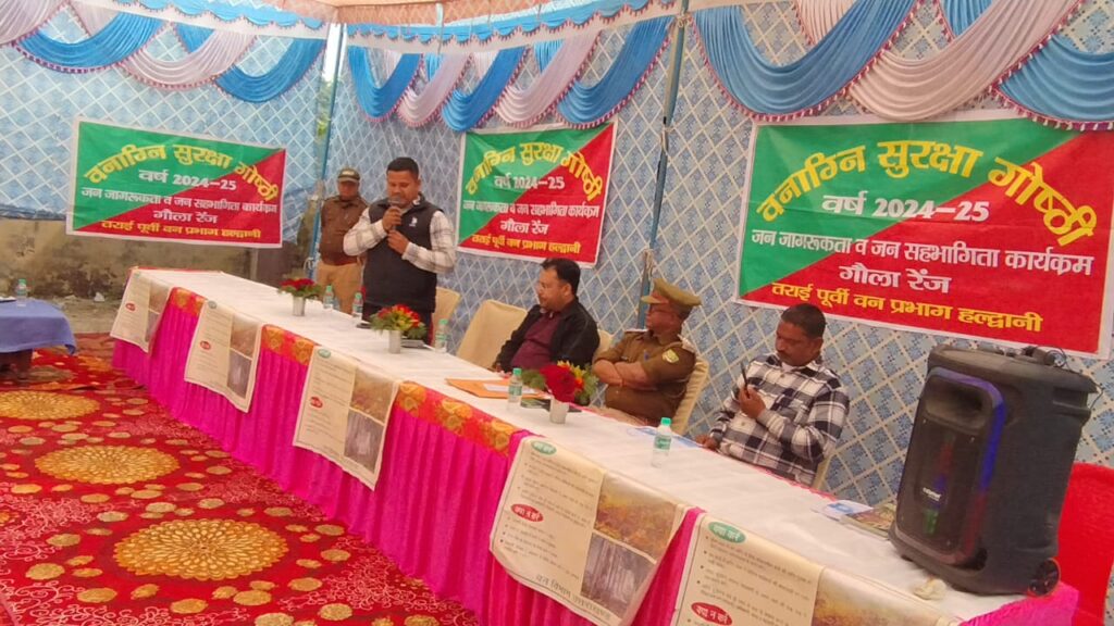 आज दिनांक 25 /02/ 2025 को दानीबंगर क्रू स्टेशन गौला रेंज ,तराई पूर्वी वन प्रभाग हल्द्वानी में अनिल जोशी, उप प्रभागीय वनाधिकारी गौला, चन्दन सिंह अधिकारी वन क्षेत्राधिकारी गौला के नेतृत्व तथा मुख्य अतिथि किशोर सिंह चुफ़ाल ग्राम प्रधान बसंतपुर गौलापार की उपस्थिति में वन अग्नि सुरक्षा जागरूकता गोष्ठी का आयोजन किया गया, जिसमें क्षेत्र के जनप्रतिनिधियों, स्थानीय निवासियों, छोटे छोटे बच्चों एवं वन कर्मियों सहित लगभग 200 प्रतिभागियों द्वारा हिस्सा लिया गया.