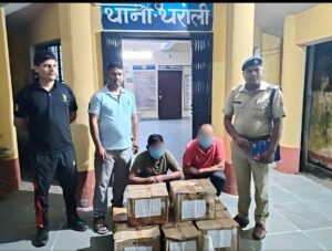 थराली पुलिस ने गैस एजेंसी रोड, नासिर बाजार क्षेत्र में चेकिंग के दौरान एक ट्राइबर कार से अवैध रूप से ले जाई जा रही 08 पेटी अंग्रेजी शराब (ब्रांड- सोलमेंट) बरामद की है। इस सिलसिले में मौके से दो अभियुक्तों को गिरफ्तार किया गया है।