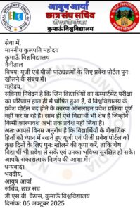 कुमाऊँ विश्वविद्यालय में यूजी और पीजी पाठ्यक्रमों के लिए प्रवेश पोर्टल पुनः खोलने की मांग के संबंध में छात्र संघ ने कुलपति महोदय को ज्ञापन सौंपा है। छात्र संघ सचिव आयुष आर्य ने बताया कि हाल ही में कुछ छात्रों के कंपार्टमेंट परीक्षा का परिणाम घोषित हुआ है, लेकिन विश्वविद्यालय का प्रवेश पोर्टल बंद होने के कारण वे ऑनलाइन प्रवेश प्रक्रिया पूर्ण नहीं कर पा रहे हैं। ऐसे कई छात्र भी हैं जिन्होंने अभी तक किसी कारणवश प्रवेश नहीं लिया है। छात्र संघ ने विश्वविद्यालय प्रशासन से निवेदन किया है कि छात्रों के शैक्षणिक हितों को ध्यान में रखते हुए यूजी और पीजी प्रवेश पोर्टल को कुछ दिनों के लिए पुनः खोलने की कृपा करें, ताकि शेष छात्र भी प्रवेश ले सकें और उनका भविष्य सुरक्षित हो सके। छात्र संघ को विश्वविद्यालय प्रशासन के सकारात्मक निर्णय की उम्मीद है। ज्ञापन सौंपते समय अभिषेक कुमार,प्रशांत मेहरा समेत कई छात्र प्रतिनिधि भी उपस्थित रहे।