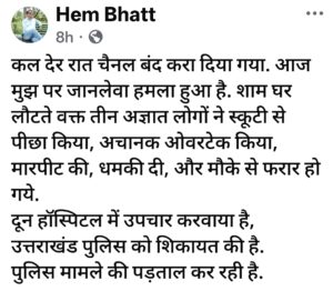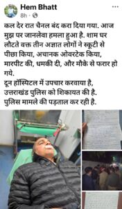 जय भारत टीवी के वरिष्ठ पत्रकार हेम भट्ट पर हुआ कायराना हमला केवल एक व्यक्ति पर नहीं, बल्कि पूरी पत्रकारिता, लोकतंत्र और संविधान प्रदत्त अभिव्यक्ति की स्वतंत्रता पर सीधा हमला है। यह घटना उत्तराखंड में कानून-व्यवस्था और पत्रकारों की सुरक्षा को लेकर शासन–प्रशासन के दावों की पोल खोलती नजर आ रही है।