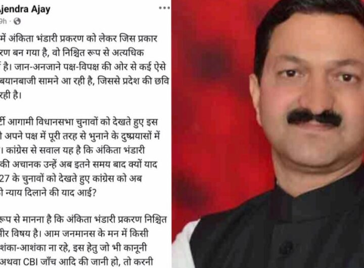 अंकिता भंडारी हत्याकांड मामले को लेकर फेसबुक पर पोस्ट करते हुए भाजपा नेता अजेंद्र अजय ने लिखा...