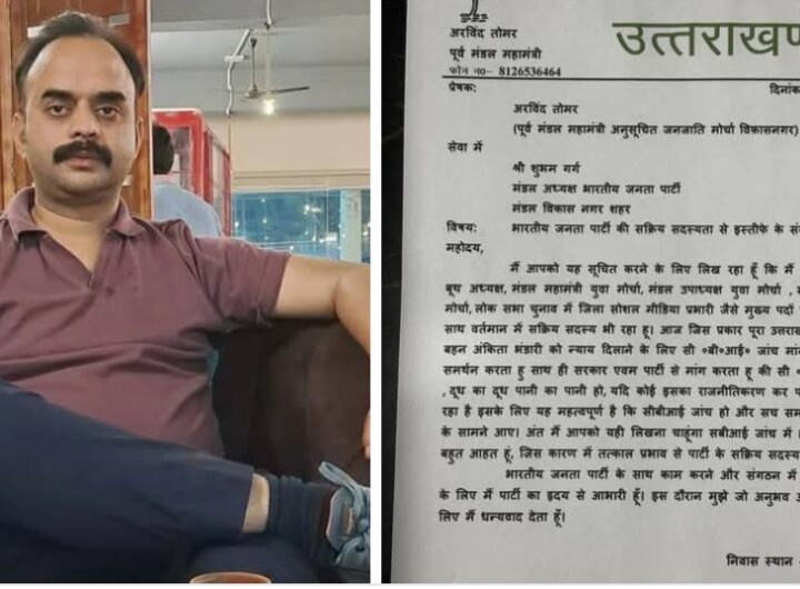 अंकिता भंडारी मामले में विकासनगर से भाजपा नेता का इस्तीफ़ा अरविंद सिंह तोमर पूर्व क्षेत्र पंचायत सदस्य...